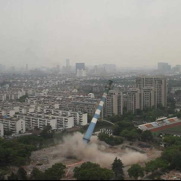 蘇州市地標(biāo)建筑之一,矗立在蘇州城南的蘇州熱電廠大煙囪,該煙囪高80m,周圍有小區(qū)、學(xué)校、高架橋、小商品市場,爆破環(huán)境復(fù)雜。我公司技術(shù)人員仔細(xì)勘察現(xiàn)場后,編制詳細(xì)的爆破方案。最終于2016年8月26日下午3點整實施爆破拆除,伴隨蘇州人33年的電熱廠大煙囪從此成為歷史。